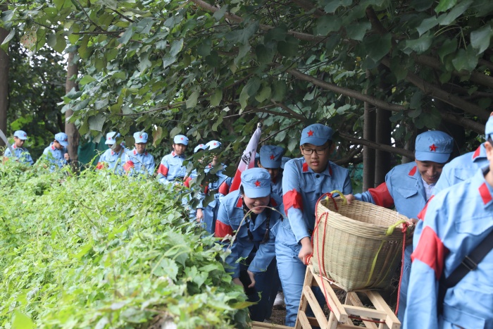 达到指定地点后,学生和家长们迅速换好军装,整理好队形,斗志昂扬地参加研学的第一项活动“重走长征路”。此项活动,由学生和家长合力组成4路纵队,“重走长征路”,体验长征途中红军运送物资的艰辛。紧接着,以家庭为单位开展“编草鞋”的有趣活动。通过两项活动,大家意识到红军在物质资源极度匮乏的情况下长征的艰辛和困苦。