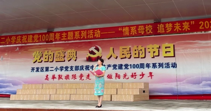 陈江老师代表开发区第二小学全体教师,给即将迈入初中生活的孩子们送上祝福,祝他们在新的人生道路上茁壮成长,鼓励他们向着新的征程扬帆起航,愿二小学子们不忘初心,牢记使命,带着二小的文化基因逐梦前行,成长为对家庭幸福、对国家昌盛有用的人才!