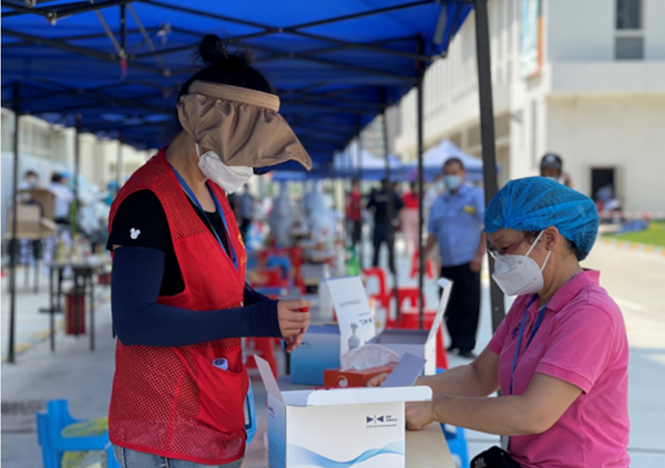健康小镇的2名志愿者积极辅助现场的医院人员进行核酸测试工作,哪里需要他们就去哪里。核酸检测瓶的标签粘贴、葵花码的验证、核酸检测队伍的指引,直至核酸检测工作圆满结束。