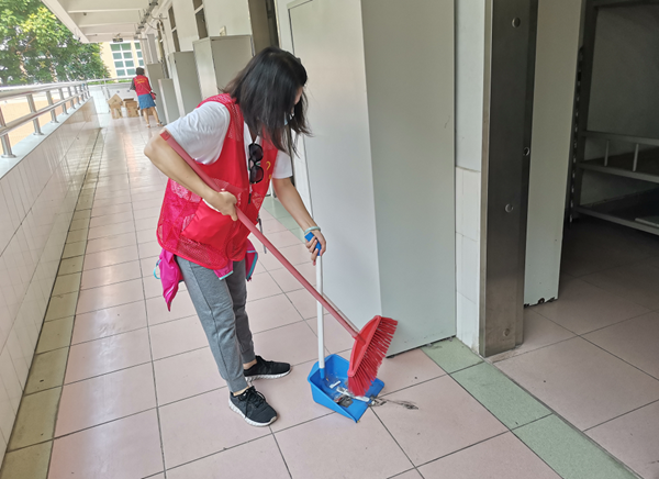 为了给隔离人员提供舒适的隔离环境,负责宿舍整理的志愿者进入宿舍马上动手把室内外的卫生打扫干净,再到物资集中点把各种物资搬运到楼上,摆放得美观整齐。