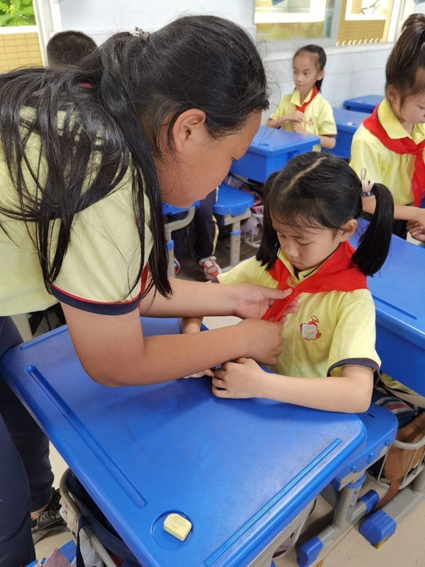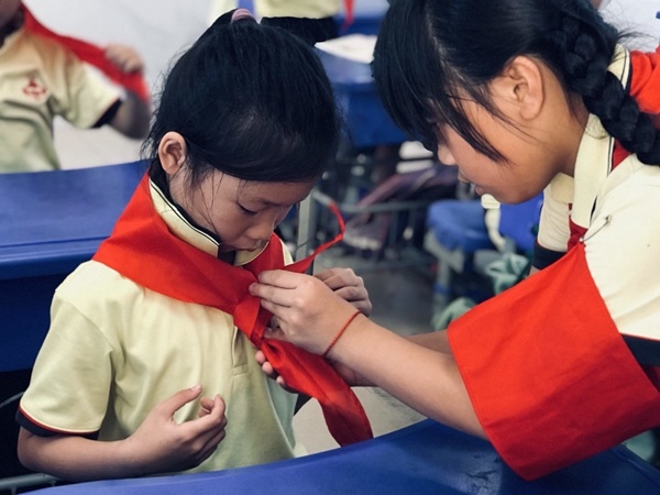 大队委员们耐心地讲解了中国少先队组织机构、发展过程和历史贡献。详细讲解了“六知六会一做”的知识,并且手把手的一年级的弟弟妹妹们敬队礼,佩戴红领巾,学唱少年先锋队队歌,如何宣誓和呼号等,一年级的小同学们听的很认真,每一双小眼睛都散发出渴望成为一名少先队员的光芒。