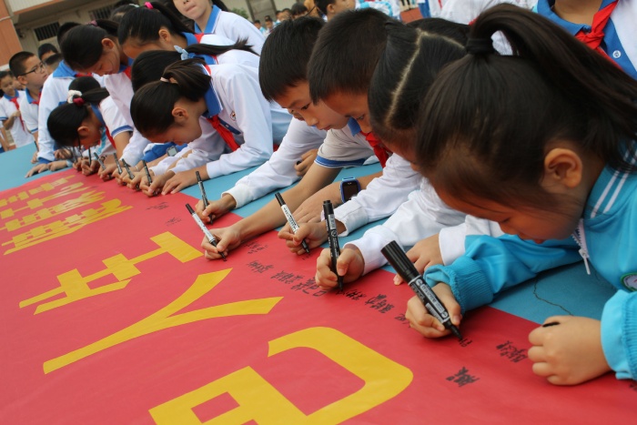 活动在庄严的国歌声中拉开序幕。五(4)中队的翁俊宇同学用列数据和具体案例向全体师生介绍目前毒品对青少年的危害情况,并指出当前队员们正处于生理和心理的成长期和突变期,容易在空虚无聊、情绪低落、遇到挫折的时候受到毒品的侵害,呼吁全体师生要认清毒品的危害,自觉主动拒绝毒品,不以好奇心为由侥幸尝试。同时,要树立正确的人生观,不盲目追求享受,寻求刺激,赶时髦、攀比,增强抵抗力。随后,全体师生在学校大队辅导员阮结连的带领下宣誓:珍惜美好年华,从我做起,从现在做起,从杜绝吸烟做起,终身远离毒品、拒绝毒品。各中队代表在“健康人生,绿色无毒”横幅上签名,表决心——珍爱生命,远离毒品。