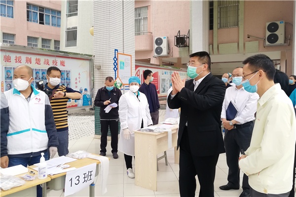 期间,正在学校出席火炬区2020春季学期学生复学工作座谈会的市委副书记、区党工委书记陈文锋同志,来到现场看望了工作人员。