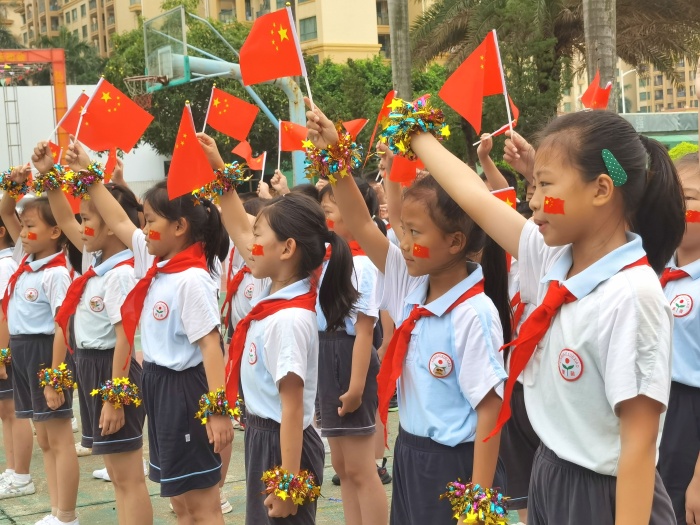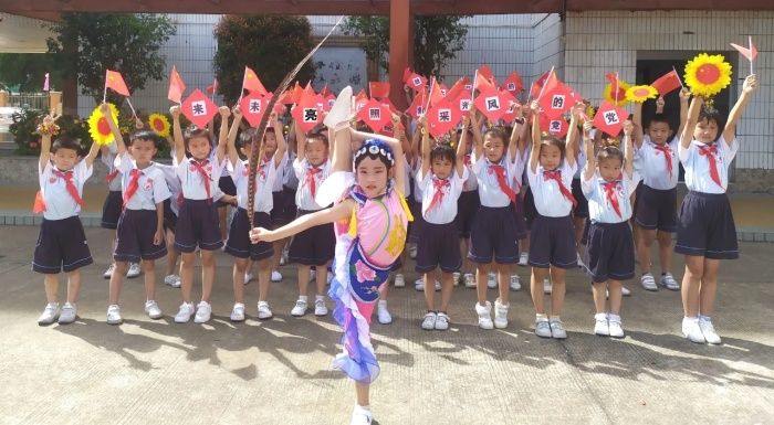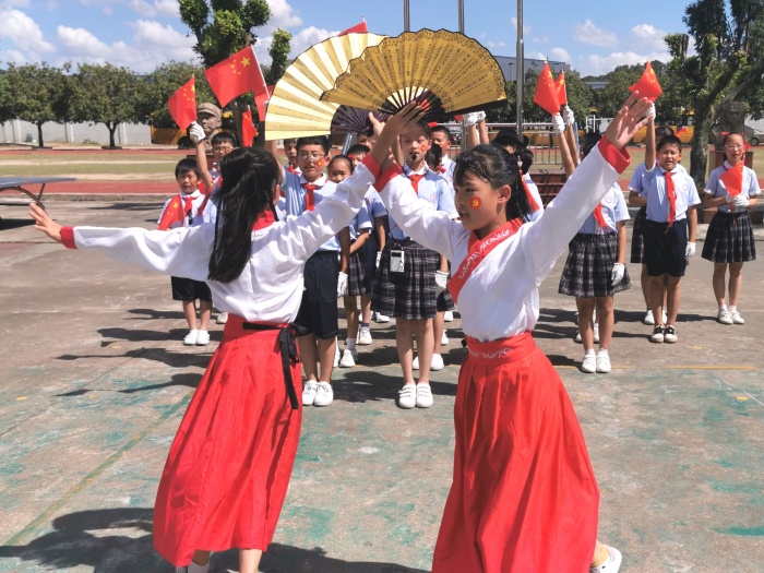 “今天是你的生日,我的中国……”“五星红旗迎风飘扬,胜利的歌声多么响亮……”“道可道,非常道;名可名,非常名......”伴随着悠扬的旋律,同学们挥舞着国旗、党旗,或歌或舞,或吟或诵,或书或画,用不同形式抒发对祖国的美好祝福和对经典诗文的无限热爱。“驿旅客逢梅子雨,池亭人挹藕花风。”韵律优美的《笠翁对韵》,一组对词就是一句念白,一副对子就是一段唱腔,妙不可言,同学们在诵读中不知不觉掌握对仗用韵,学会遣词造句,奠定了国学根基。朗朗上口的《三字经》《千字文》《弟子规》节奏明快,更汇集古代圣贤思想,同学们在诵读中传承着少年养志、知书达理的中华文明。