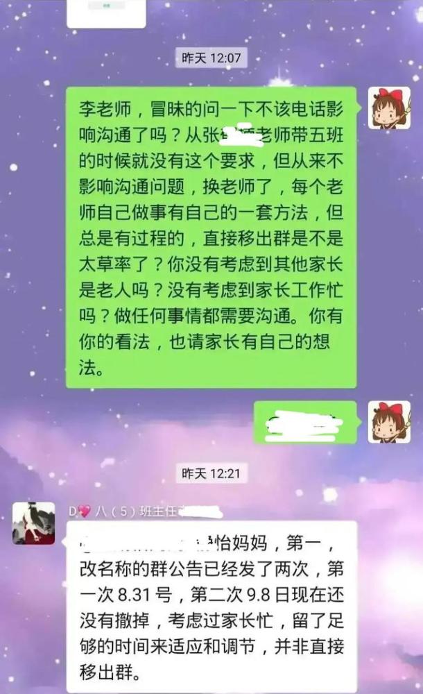 班主任说已经留够充分的时间让各位家长适应了,关于家长拒不配合被移出群聊,她曾发过两次群公告提醒,并未有人提出过异议,如果家长拒不配合可以选择不加入家长群。