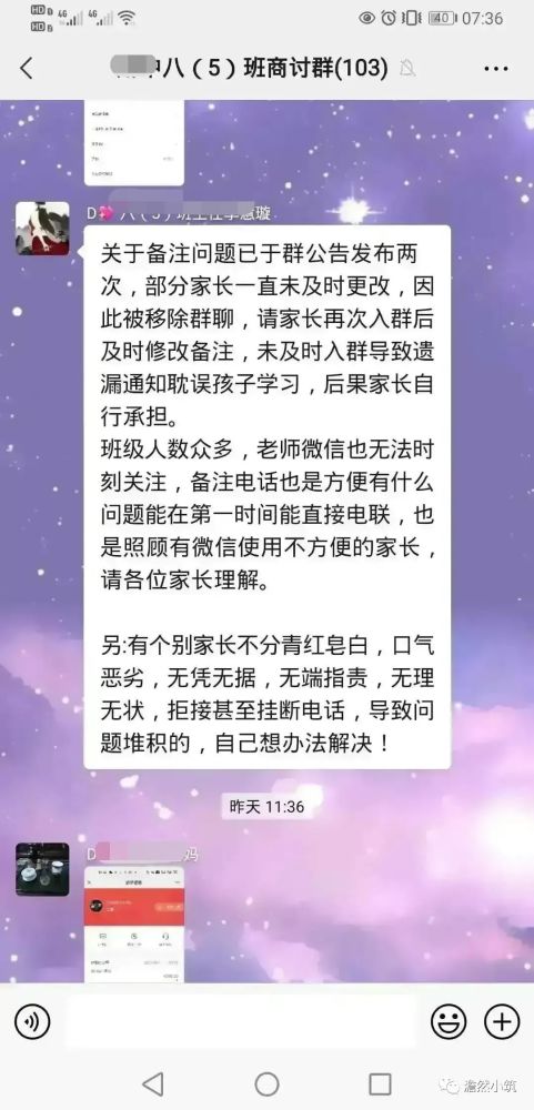 起因其实就是新学期孩子班级换老师了,即家长群也换了新群主,老师为了联系方便要求家长们在群里修改备注并且在备注里把自己的手机号也写上,以便于有什么紧急事情能够及时联系到家长。