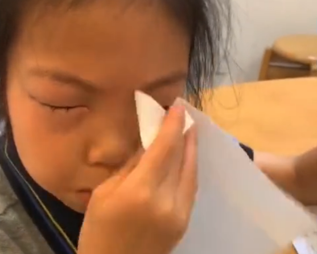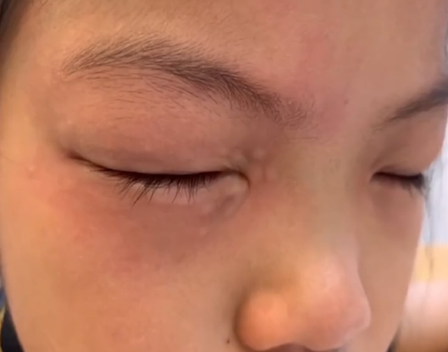 视频的作者称,孩子每次一做数学题,眼睛四周就“长疙瘩”,做语文题则不会。也曾带孩子去医院看过,过敏源也都测试过,学习用品也并没有会引起过敏的材质。