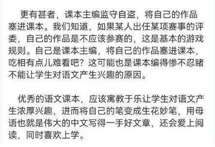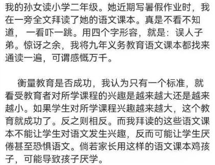 "衡量教育是否成功,我认为只有一个标准,就是受教育者对所学课程的兴趣是越来越大还是越来越小?如果学生对所学的课程兴趣越来越大,这个教育就成功了,反之则相反。而我拜读的这些语文课本不但不能让学生对语文发生兴趣,反而可能会让学生厌倦,甚至恐惧语文。”