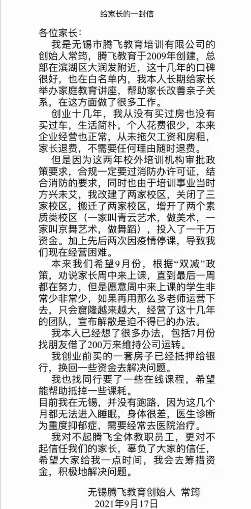 看了常老师的这封信,感觉确实不易,与其他机构负责人卷钱跑路相比,常老师还是值得敬佩的,不知道他会用什么办法来解决好问题,只是苦了家长和学生,无法到上课无法退款,可能现在最好的办法就是等了吧。