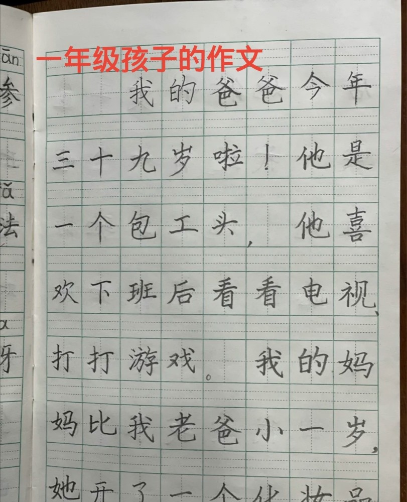 这个小学一年级孩子的家长每天督促孩子练字,没多久,孩子的字有了很大的变化,以前写得七零八落的名字,现在变得工整紧凑了。