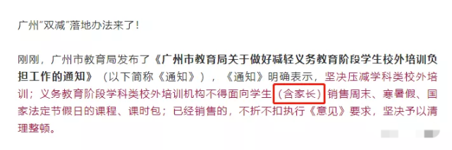 来一起看看广州双减关于这一条的政策:《广州市教育局关于做好减轻义务教育阶段学生校外培训负担工作的通知》明确表示:义务教育阶段学科类校外培训机构不得面向学生(含家长)销售周末、寒暑假、国家法定节假日的课程、课时包;