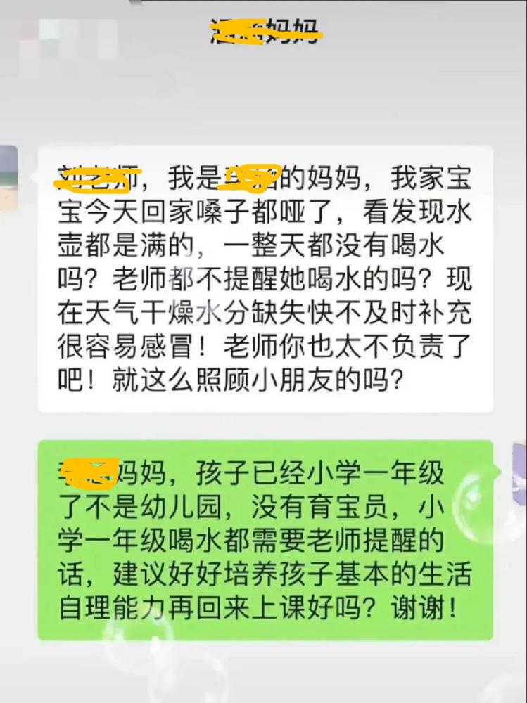 近日,一位担任一年级班主任的小学老师被家长给“教训”了,原因是一名学生的妈妈发现自己的孩子放学回家嗓子沙哑,嘴唇干裂,检查一看她的水壶都是满的,原来她一整天都没有喝水!这位妈妈又急又气,给她发了信息,训斥她太不负责任了,不照顾小朋友。