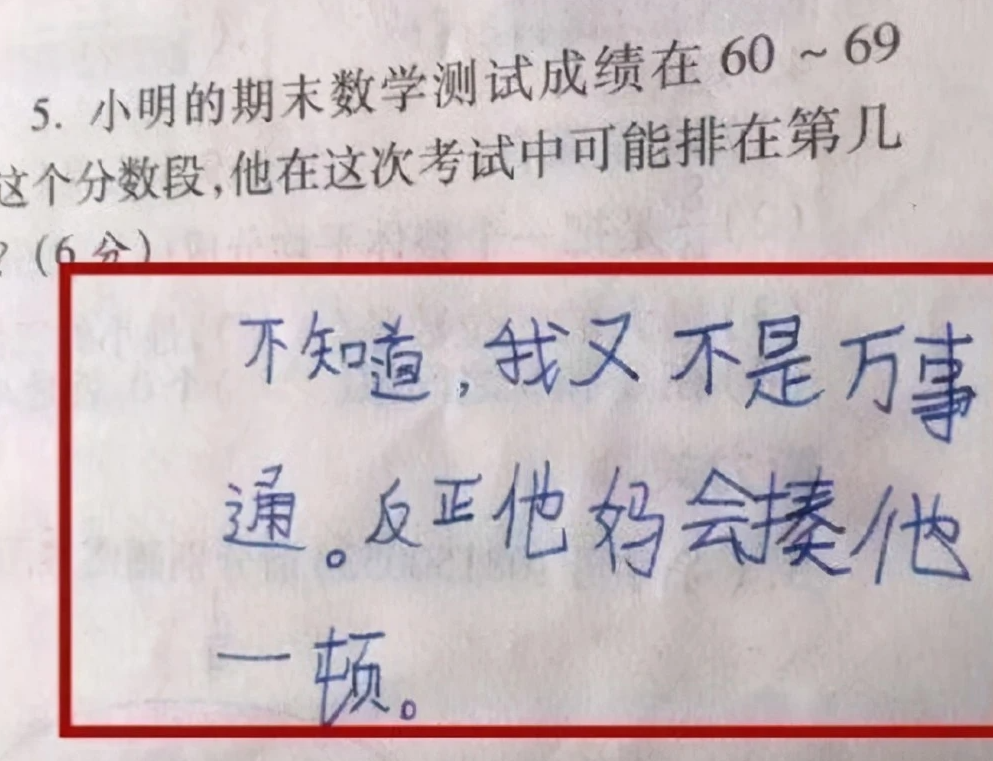 这位小学生的答案是:我不是万事通,反正他妈会揍他。这个答案清奇好笑,但是你是否想过,你考试如果考到了60-69这个分数段,你的妈妈也是会揍你一顿的,所以考试时别任性。