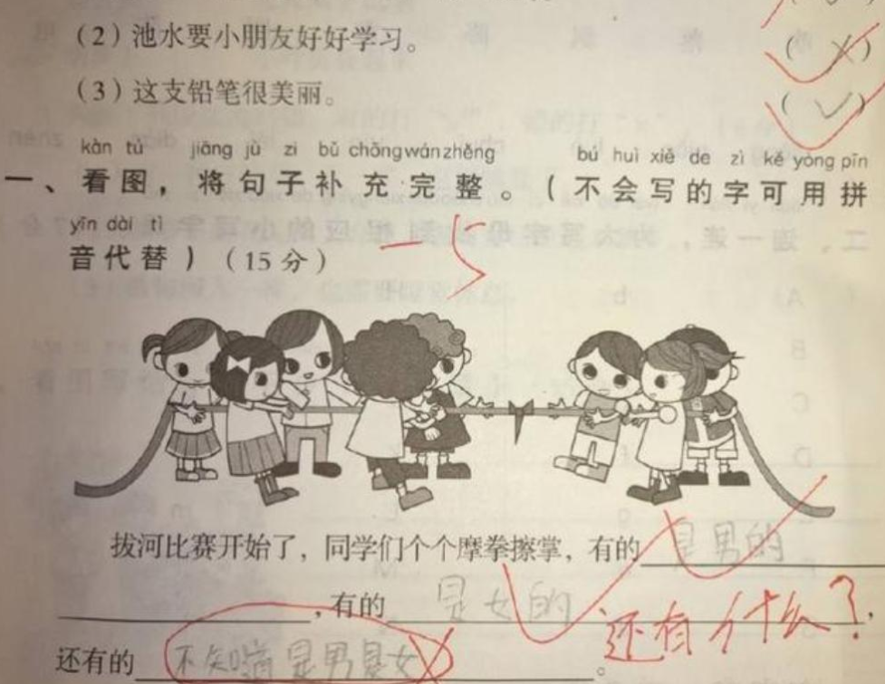 其实小学生完全可以用“有的在喊口号,有的在喊加油,有的在做裁判”来回答。但是她却写成了“有的是男的,有的是女的,有的不知道是男是女。”前面两个勉强算你对,这第三个真实给不了分。