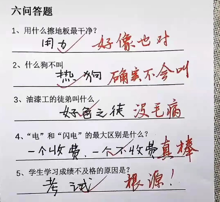 小学生的调皮捣蛋、天真烂漫也会体现在考试中。之前听一些老师感叹:看小学生的试卷时不能喝水,否则会笑喷。以前我还真不信,但是看着这些走红的“倒数第一”试卷,我信了。