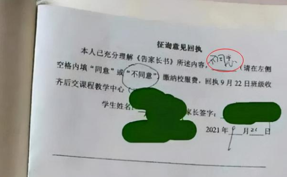 在上海的一所学校,学校收校服费遇到障碍,一名家长在校服的收费通知单上写“不同意”引起轩然大波,这到底是怎么回事呢?