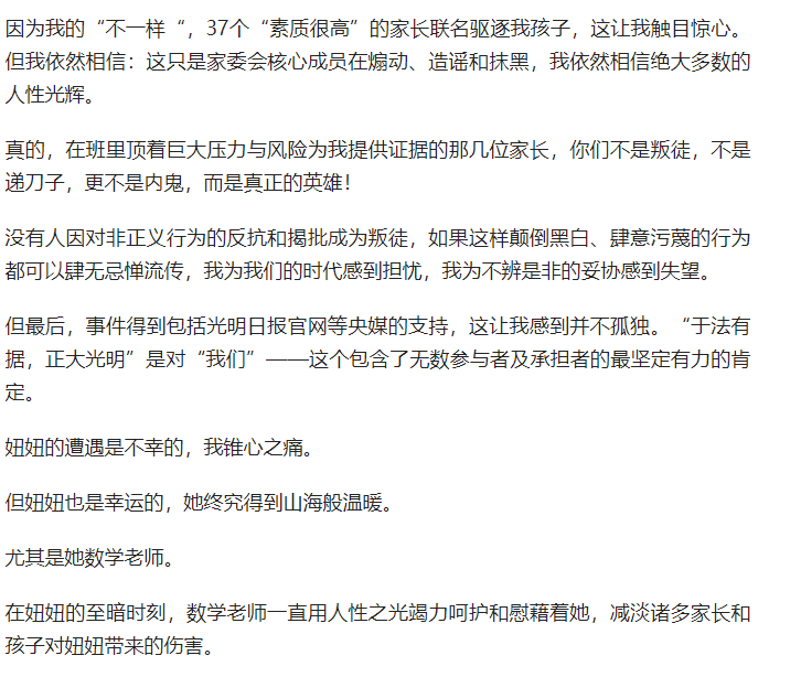 第五、被各方反复提及的不愿做“鸡娃”,所以被37位家长和老师排挤。