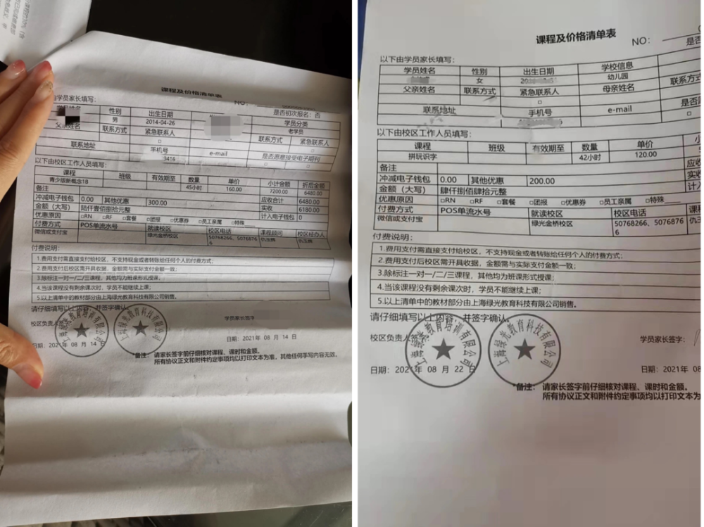 7-8月续费课程大多发生在2021年9月以后的秋季,但许多家长缴费后孩子无法上一堂课。绿光教育选择在9月3日周五宣布停业,让家长无法不怀疑是否涉嫌恶意侵吞家长学费,同时双休日各职能部门双休日休息,易引发极大的社会动荡,造成了极其恶劣的社会影响。根据家长电询虹口区教育局情况,至8月25-26日,绿光教育始终报备经营情况正常,并未提及经营困难等情况。