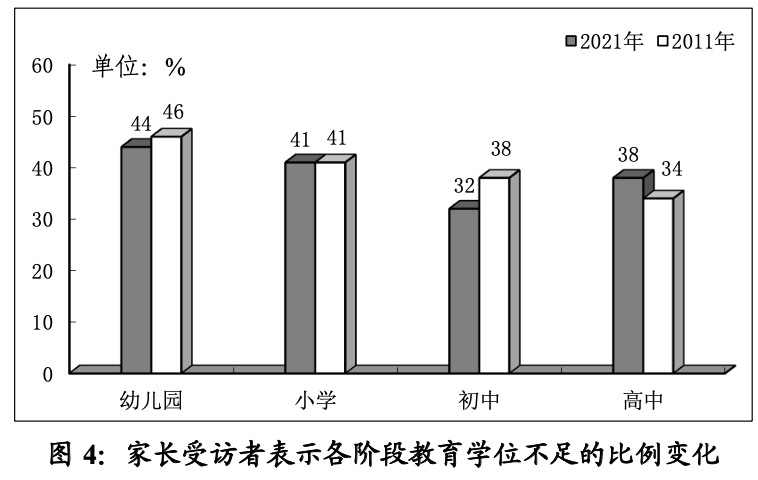 在学位供给方面,表示各阶段教育的学位“都充足”的受访者比例仅有17%。进一步关注家长受访者的评价发现,在表示学位不足的家长受访者中,最多人认为幼儿园学位不足,比例为44%;认为小学学位不足的家长有41%;认为初中、高中学位不足的家长亦均超过三成。与2011年相关调查相比,家长受访者对各阶段教育学位供给的评价没有太大改善。