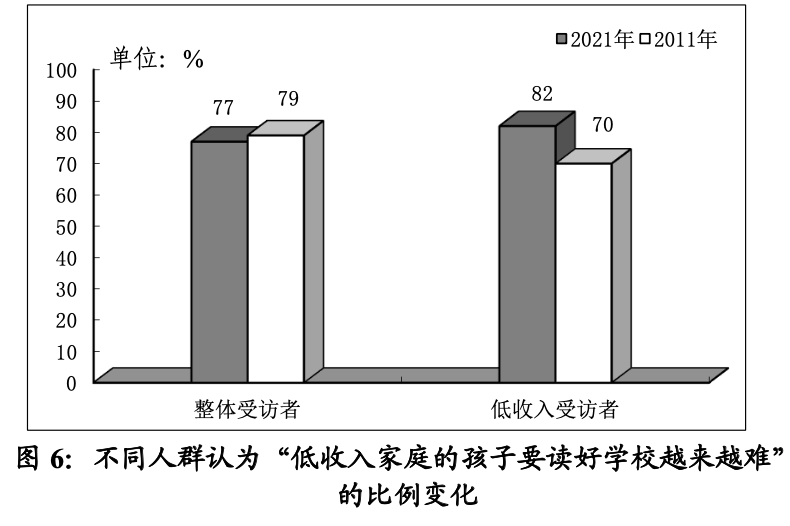 此外,77%的大多数受访者表示低收入家庭的孩子要读好学校越来越难了,数据与2011年相比没有变化。进一步分析还发现,低收入受访者持此看法的比例上升,较2011年上升了12个百分点达到82%。