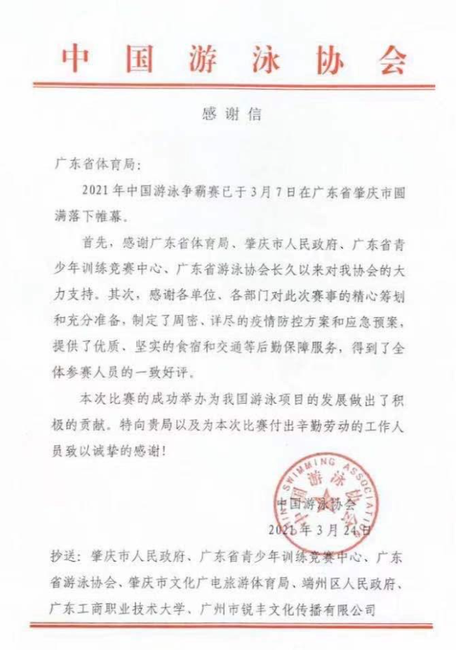 24日,中国游泳协会向广东省体育局发来了感谢信,信中表示,2021年中国游泳争霸赛已于3月7日在广东省肇庆市圆满落下帷幕,本次比赛的成功举办为我国游泳项目发展做出了积极的贡献。