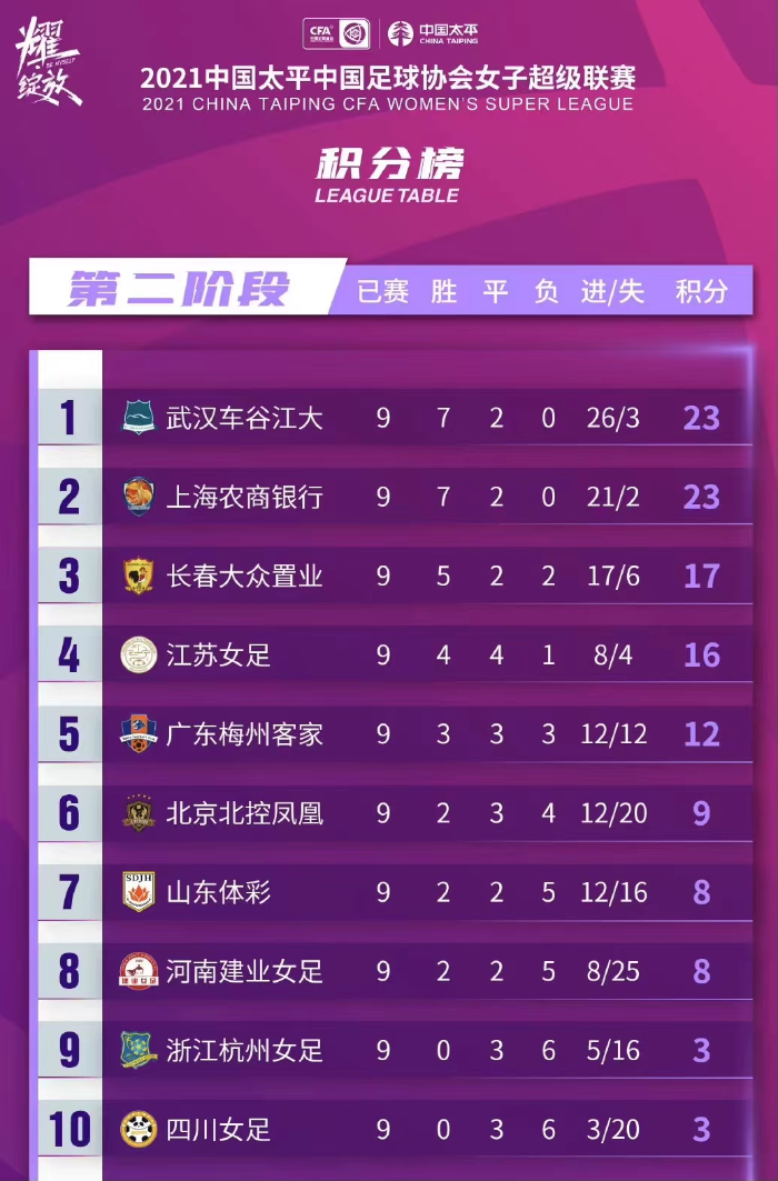 本赛季女超第三阶段的比赛,积分榜前5的球队参加争冠组的比赛,而后5名的球队则参加保级组的角逐,进而决出本赛季女足的最终排名。