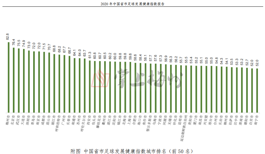 15日,中国足协发布《2020年中国省市足球发展健康指数报告》,报告指出,根据指标体系计算得出,百分制下,2020年中国省市足球发展健康指数城市排名,梅州市82.8分排名第一,其次是北京市和武汉市。前十还有大连市、深圳市、青岛市、南京市、成都市、眉山市、丽江市。
