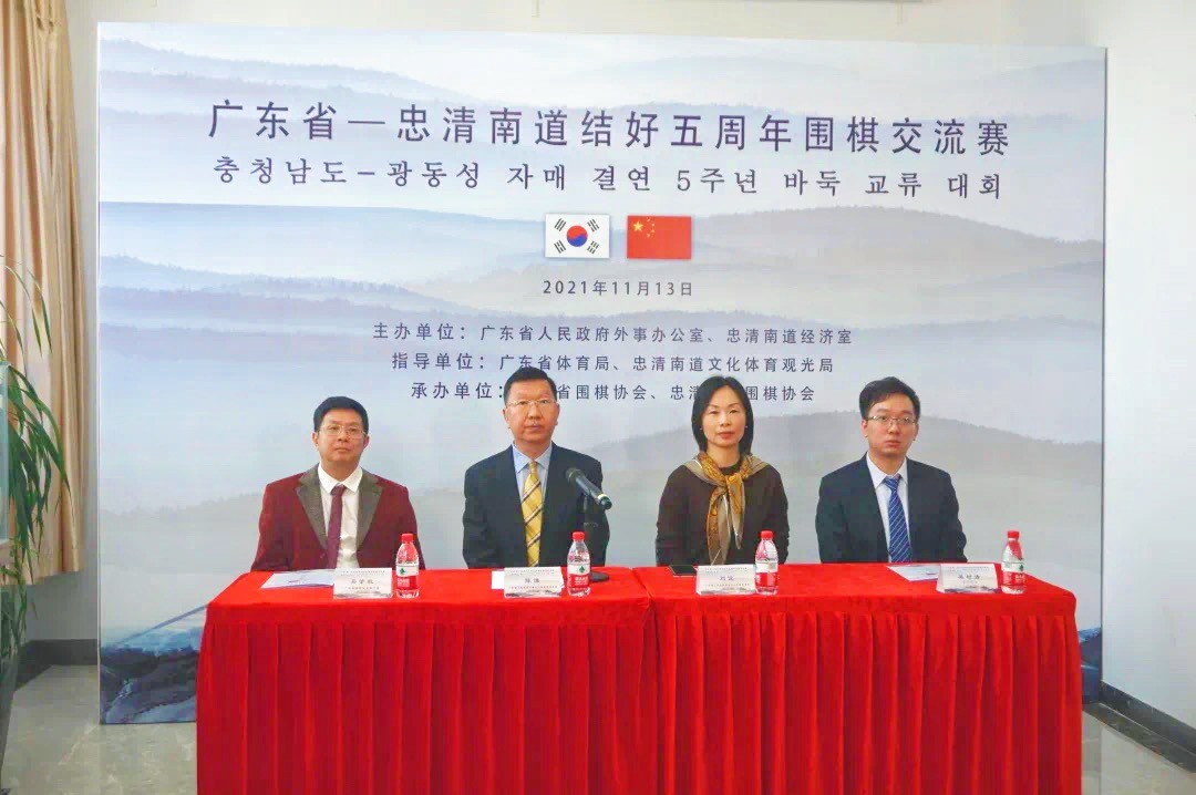 11月13日,广东省—忠清南道结好五周年围棋交流赛以线上形式在中韩两地顺利举行。本次比赛以“以棋为媒,共叙友谊”为主题,由广东省人民政府外事办公室与韩国忠清南道经济室共同主办,广东省体育局和忠清南道文化体育观光局共同指导,广东省围棋协会和忠清南道围棋协会承办。