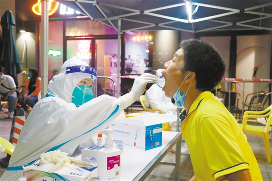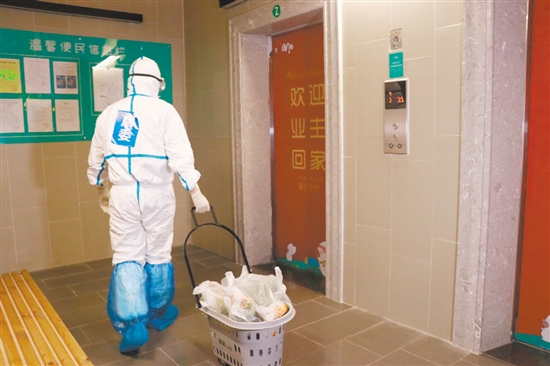 当晚7点,演练开始,公安部门第一时间对管控区域拉起了警戒线,设立卡点进行管控。封控区实行“封闭隔离、足不出户、服务上门”,管控区实行“只进不出”的管理措施。社区三人组上门将“密接人员”带下楼,交接给重点人员转运专班,由防疫专车闭环转运至集中隔离场所进行集中隔离。医护人员进入封控区为居民进行上门采样,网格员无接触将生活物资送上门,并通知居民自行开门收取。与此同时,网格员通过上门、电话等多种形式,组织管控区的住户到采样点接受核酸检测。在网格员和志愿者指引下,居民在采样点排队,井然有序地完成采样。