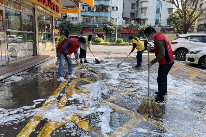 他们顶着太阳,不怕辛苦,热情高涨,干劲十足,清扫大街小巷的纸屑、烟头、落叶以及市场周边的生活垃圾,清理道路两旁、废旧工厂周边的卫生黑点。他们不怕脏,清理水渠堆积物、道路堆放物,合力清洗路面污渍。
