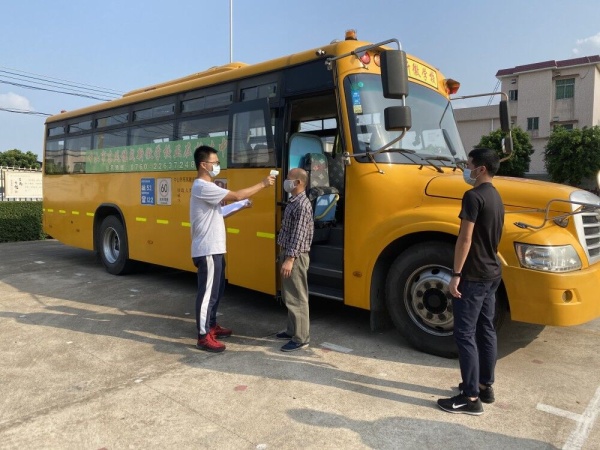 长鼻子校车整齐地排列在操场一角,它每天都会被司机清洗、消毒,以洁净的身姿接送可亲可爱的新徽学子们。值日领导早已守候在校车旁,对司机及跟车教师进行体温测量。看,班长举着班牌,后面跟着的学生们保持着一米距离列队放学。整齐的队伍,适当的距离,这就是最美的“新徽学子”。他们上车前由跟车教师进行体温测量,上车后跟车教师检查系安全带情况,确认无异常后校车才能离开学校。