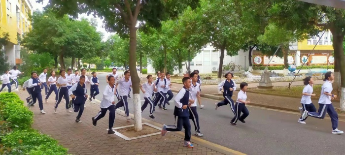 一阵急促的警报声响起,学生们迅速用袖子捂住口鼻,弯着腰,跑向操场。全体教师按照既定的路线,组织学生有序逃生。全体人员撤离到运动场后,立即清点人数并向主席台汇报。整个演练过程紧张有序,全体师生全部撤离到安全区域,达到较好的演练效果。