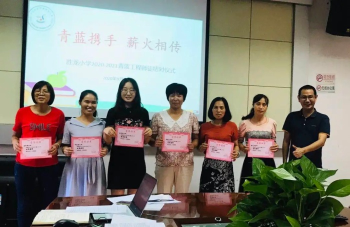 为促进青年教师的专业成长,发挥学校骨干教师和名师的示范和辐射作用,加强教师间的相互学习,让青年教师能在日常的教育教学工作中“教有引领、困有所帮、惑有所解”,实现教育教学能力和班级管理能力的同步提高,全面推进学校教师队伍智慧发展,进而提高课堂效率和教学质量。9月21日下午,胜龙小学全体教师在会议室举行了以“青蓝携手,薪火相传”为主题的 “青蓝工程师徒结对”启动仪式。