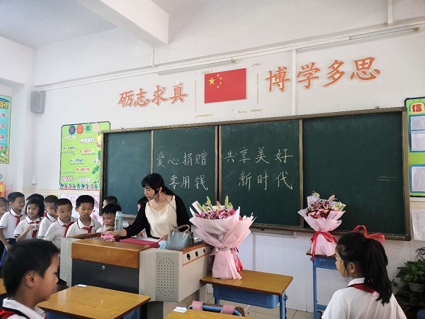 捐款活动以中队为单位,在各自的教室进行。每个班的黑板上都写着醒目的“爱心捐赠零用钱,共享美好新时代”几个大字。队员们在中队辅导员的带领下井然有序排好队面带微笑地走上讲台,手中高举着自己的零花钱,郑重其事地投向捐款箱,一元、五元、十元…… 爱心在一间间教室传递,不一会,捐款活动圆满结束!