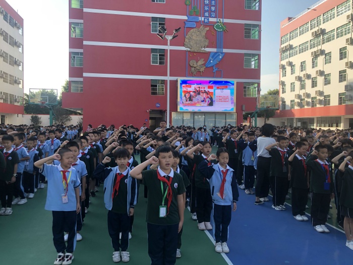 最后在总辅导员汪恒老师带领下,全体少先队员重温入队誓词。少先队员们举起右拳,庄严宣誓。“准备着,为共产主义事业而奋斗!”——“时刻准备着!”整齐响亮的呼号声将庆祝建队日活动的氛围推向高潮,同学们的声音在校园内回荡,青春的信念和梦想在金秋暖阳下升腾成希望。学校少工委组织的活动结束后,各大队和中队也分别开展了主题队会活动。