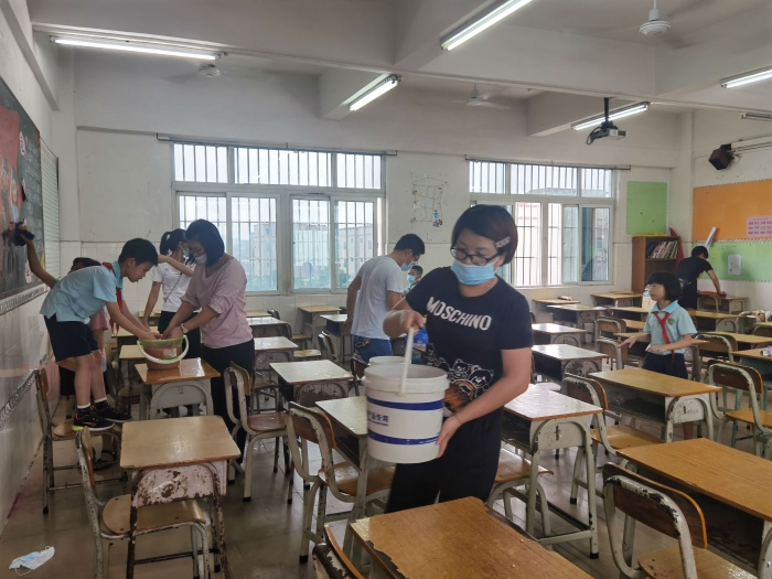 烈日炎炎,却也挡不住每个班级的家长志愿者积极参与的热情。家长和孩子们在班主任老师的带领下来到新班级,二话不说,撸起袖子直接干活。孩子们拿着水桶接了水,开始把课室的桌椅擦干净,还主动擦门框窗框等。家长和老师们也没有闲着,个子高的家长取下窗帘,清除天花板的卫生死角,大家相互配合,分工合作。孩子们做完力所能及的班务后,又主动帮助大人们干活。在这种热火朝天的气氛中,原本落满尘灰的课室此时已焕然一新,墙壁、地面重新恢复了光洁明亮;窗帘也散发着清新的香气;杂乱无章的课桌椅摆放得整整齐齐。看着窗明几净的教室,大家脸上不约而同地露出了笑容。
