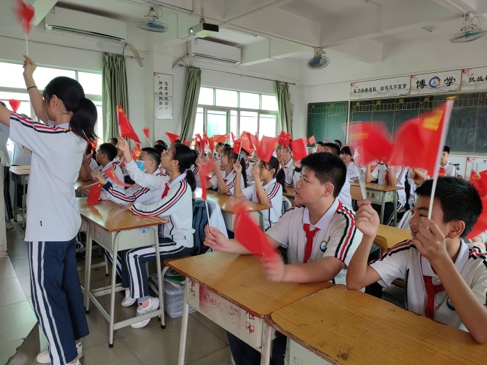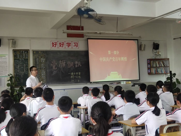 初一年级各班主任也开展了《党旗飘飘》主题班会。初一(10)班郭钦洲老师结合党史并结合学生实际,每位同学派发一面国旗和党旗,详细讲解了党旗的知识和在中国共产党领导下的伟大事件,同学们手摇党旗、国旗,在合唱革命歌曲中感受革命精神,最后同学们在党旗和国旗下宣誓:成长于港口中学这片热土,聆听恩师们的教诲,感受父母的恩情,心怀报效祖国之志,要为共产主义事业添砖加瓦。
