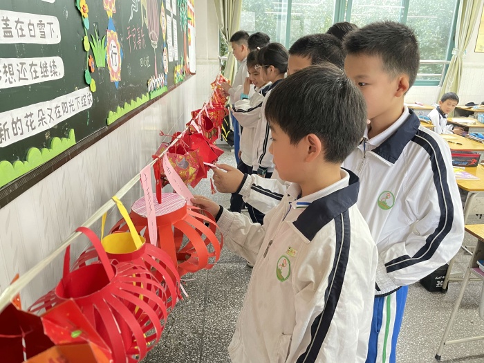 元宵节怎么能离得了灯笼呢。瞧!班级里挂着同学们亲手制作的灯笼,一盏盏富有创意,制作精巧,让同学们不由得驻足观看,整个校园洋溢着浓浓的节日气氛。