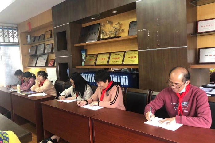 詹主任向大家介绍了“红领巾争章”,“红领巾争章”共有12个基础章,其中向阳章、传承章、立德章、立志章统称红星章,梦想章、小主人章、团结章、健体章属于红旗章,奉献章、劳动章、勇敢章、节约章属于火炬章。詹主任介绍了这12枚章背后内涵的意义。此外还有星级章,各个等次都有个人章和集体章,集体奖章结合了学校每周评选的优秀班级和学生个人表现给予相应的积分;个人奖章从学生的学习成绩、行为习惯等各个方面综合评定后给予个人积分。积分到达其中的星级奖章标准时,便可获得相应的奖章称号。个人奖章同时可以参与评选国家、省、市、县级“红领巾奖章”。学校还另外设一枚特色章“明心章”从音体美等个人特色方面鼓励多才多艺的学生。