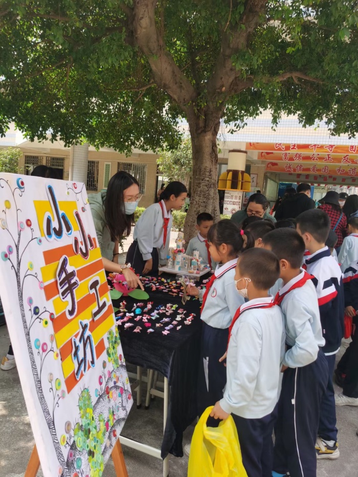 义卖活动开始前,每个班级的同学分工明确,各司其职,定制口号,制作展板和横幅;登记义卖物品、贴好价签;换好零钱、备好账本和钱袋,有条不紊地做着准备。同学们拿出自己心爱的玩具、图书、小摆设、手工作品和家长亲手制作的小吃等等进行爱心义卖活动,甚至有些班级还准备有抽奖活动、购买盲盒、福袋等营销方式,来增加了义卖的趣味性。学校的美术组、书法组和家长志愿者也摆出了特别准备的摊位来为义卖活动助兴。