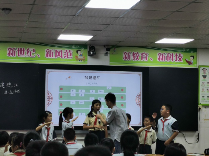 活动伊始,由巫勇华老师执教一节古诗吟诵教学课。巫老师将《宿建德江》这首诗中的意象绘制成了一幅充满意境的画卷,带领孩子们走进古诗,品味诗文,感悟诗文之美。本课最大亮点是能采用声韵分析的方法,教会学生在吟诵中引导学生理解古诗,并抓住“舟”、“日暮”、“月”等字,从意象的角度分析这些字的深刻涵义,让学生们体会到关键字词的理解能在古典诗文中领悟古诗的文化背景。