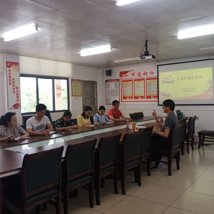 打印 |为了进一步加强对入党申请人的教育和培养,提高发展党员的质量,镇南小学党支部按照学校党员发展规划,4月7日上午,对2021年3月向党支部递交了入党申请书的教师进行集体谈话及党史学习教育,学校党支部书记杨红卫、支部宣传委员余明丽,以及六名申请入党的老师一起参加了此次会议。