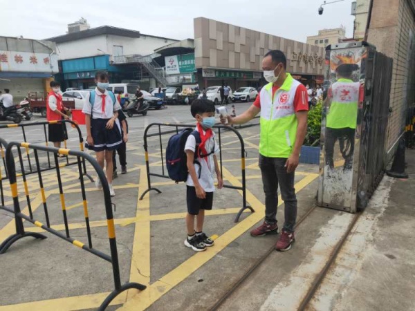 从上午七点开始,在学校门前,交通协管、保安、学校领导和家长义工顶风冒雨维持入校秩序,分工合作进行路口交通疏导和校门测温。门口增设安全通道,学校贴心地在地面贴上间隔一米的标志点,并细心提醒孩子们保持1米安全距离。横栏镇教育事务指导中心教科研王春明专干也一早到三沙小学指导学校开学工作。