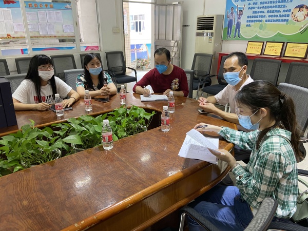 接着,大家来到学校的会议室,就学校的开学准备工作进行了详细深入的交流:返校学生有多少人?教职工有多少人?有没有校医?开学准备工作有没有验收?有没有课外活动方案?是否有因疫情不能返校的师生?等等。游赞球主任、黄燕芬副校长和游学伟校长对这些问题进行了详细的汇报。冼景文副科长对学校的开学准备工作表示肯定,并提出要求:学校新加入的教师和学校配餐公司的新工作人员,要做核酸检测;学校要按要求做好工作,有情况及时上报。