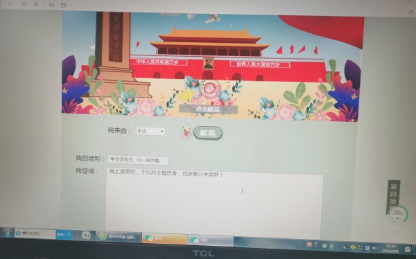 为缅怀先烈,牢记使命,传承红色基因,弘扬爱国主义精神,引导学生慎终追远、怀缅先辈,继承先烈遗志,珍惜幸福生活,自觉践行社会主义核心价值观,争当担当民族复兴大任的新时代好少年,横栏华文学校结合实际情况于4月1日——15日开展网上祭英烈主题教育活动。
