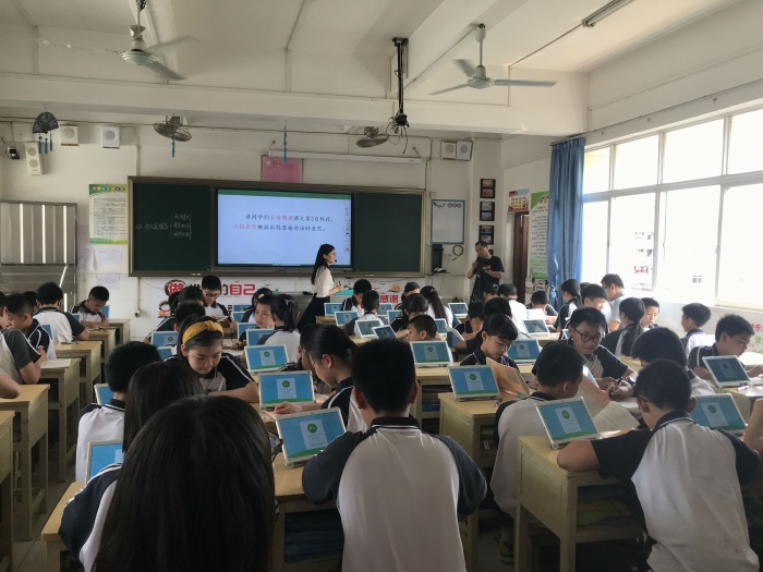 首先是语、数、英三科的智慧课堂展示:胡玲玉老师在四(4)班教室上了一节语文课《为人民服务》,梁坤志主任在录播室上了一节数学课《平移》,吴金玲老师在五(2)班教室上了一节英语课《Unit3 On Vacation》。三位老师在课堂中充分运用了智慧课堂的大数据统计和作业提交功能,及时了解学生的学习达成度,并借助智慧课堂的互评功能让同学们可以互相学习、互相纠正,让学生在相互学习中通过思与辩的方式更好地掌握所学的知识,真正让学生“站在中央智慧生长”。智慧课堂系统功能的运用,大大提高了课堂效率。