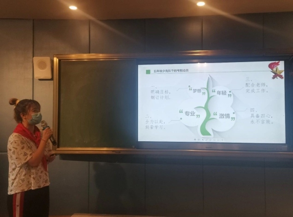会议开始,与会师生齐唱《中国少年先锋队队歌》,少先队员行队礼。大队长冯紫雯对上学期少先队干部工作做总结发言。