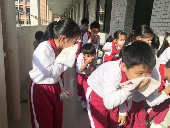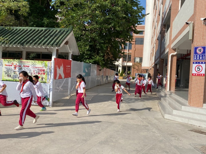 为了实施好这次演练,学校制定了详细的消防疏散演练方案,对各班逃离的路线及安全出口老师的职责等内容都做了明确的规定。演练开始前,各班级预先进行了演习布置工作,班主任对学生做了详尽的演习讲解。16:00随着警报的响起,各班主任老师迅速组织学生疏散,其他老师们也在第一时间赶到自己当时所在楼层拐角处配合疏散学生。学生在老师们的指挥下,按照演练方案中规定的路线,弯着腰,猫着步,用毛巾捂住口鼻,沿着学校指定楼梯口快速前进,有序撤离到学校操场的安全地带集合。经计时,从警报响起到全体师生从课室疏散、集合完毕,共计用时不到2分钟。