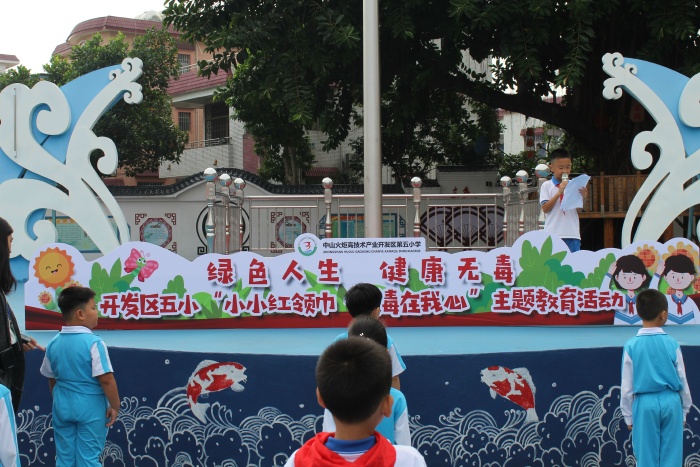活动在庄严的国歌声中拉开序幕。五(4)中队的翁俊宇同学用列数据和具体案例向全体师生介绍目前毒品对青少年的危害情况,并指出当前队员们正处于生理和心理的成长期和突变期,容易在空虚无聊、情绪低落、遇到挫折的时候受到毒品的侵害,呼吁全体师生要认清毒品的危害,自觉主动拒绝毒品,不以好奇心为由侥幸尝试。同时,要树立正确的人生观,不盲目追求享受,寻求刺激,赶时髦、攀比,增强抵抗力。随后,全体师生在学校大队辅导员阮结连的带领下宣誓:珍惜美好年华,从我做起,从现在做起,从杜绝吸烟做起,终身远离毒品、拒绝毒品。各中队代表在“健康人生,绿色无毒”横幅上签名,表决心——珍爱生命,远离毒品。