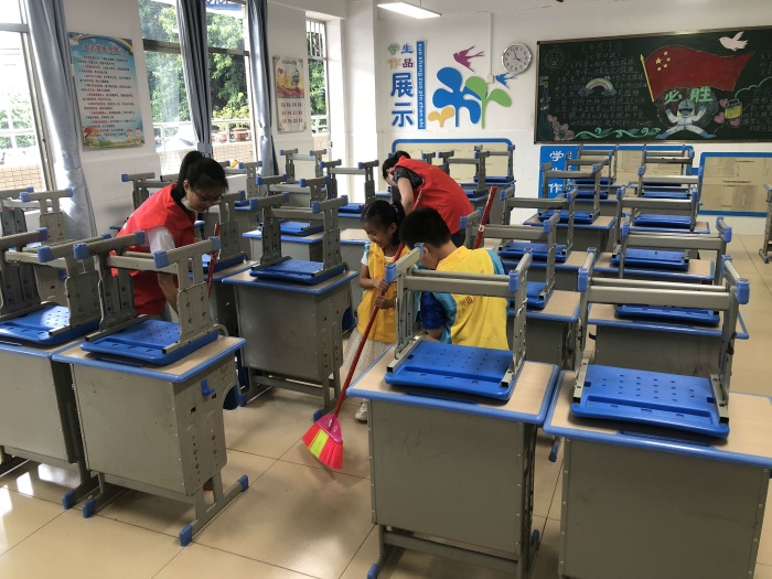 亲子义工队成员、教师志愿者们利用放学后的时间留校开展本次爱国卫生运动。在大扫除活动中,志愿者们热情高昂,分工明细,配合默契,拿起抹布、舞动扫帚,对校园内外、教室、操场等进行擦拭、垃圾清除,对走廊、过道、楼梯及卫生死角进行了一次彻底的冲洗,做到校园及周边公共区域干净、整洁、清爽,经过大家的辛勤劳动,整个校园环境焕然一新。整个过程体现出“我奉献、我快乐、我参与、我成长”的精神内涵。